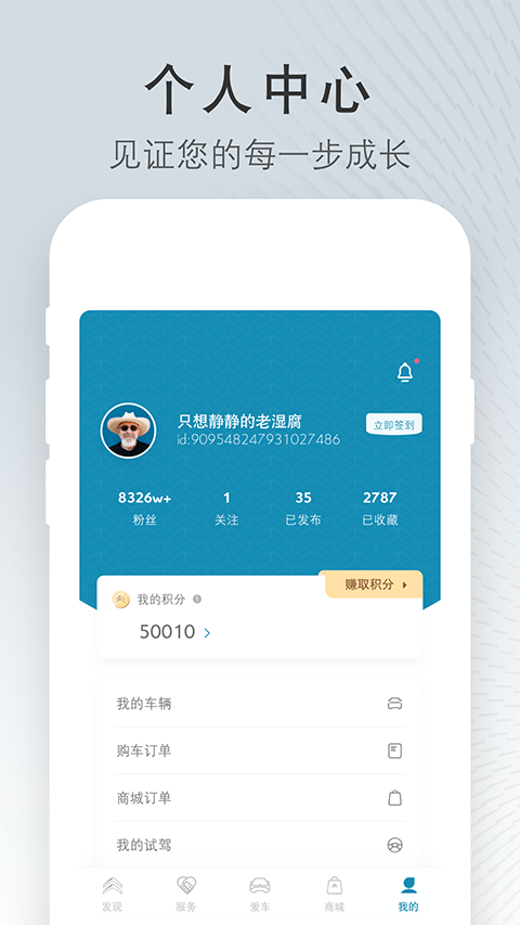 查看我的车辆订单和积分订单,发布记录,消息与收藏内容,个人信息设置修改,联系在线客服。