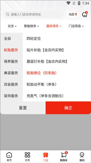 1、用户打开并登录京东养车app后,进入门店页面中点击【服务项目】,在弹出的下拉选项中选择服务项目,例如这里选择轮胎换位