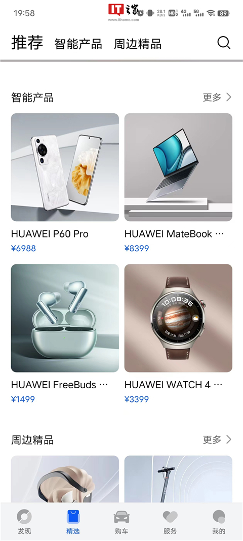 2、精选版块则为“购物频道”,可以购买华为旗下的各种产品,“周边精品”有四款智选产品;