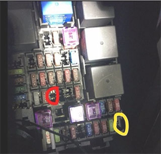 红圈处,是接ACC的保险,拔来,把红色线直接缠到保险的插脚上,再复原插回去即可。黄圈处,是接常电的保险,同样接行车仪的黄色细线,弄好复原。线接好后,把多余的线束用扎带整理一下,绑好了放到保险盒的左下方即可,不会影响手抠开关的。