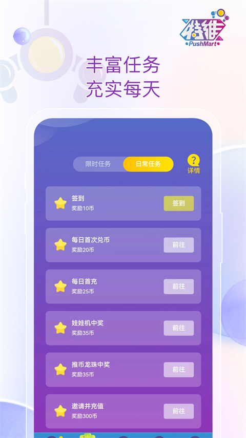 特维潮玩app最新版是一款通过手机在线畅玩真实游乐场里各种娱乐机台的软件,让大家足不出户就能体验到抓娃娃的乐趣。软件在界面设计上,采用经典的小清新配色,简洁明了的界面布局,帮助大家快速找到自己需要的功能。软件功能齐全,主要是以礼品机为主,让玩家在嗨玩的同时,得到潮玩礼品,体验到别样的乐趣。此外,特维潮玩app最新版对接第三方集市,玩家可以轻松交易或置换礼品。礼品、娱乐、社交、解压一个都不能少!所以大家还在等什么,感兴趣的小伙伴赶快来下载体验吧。