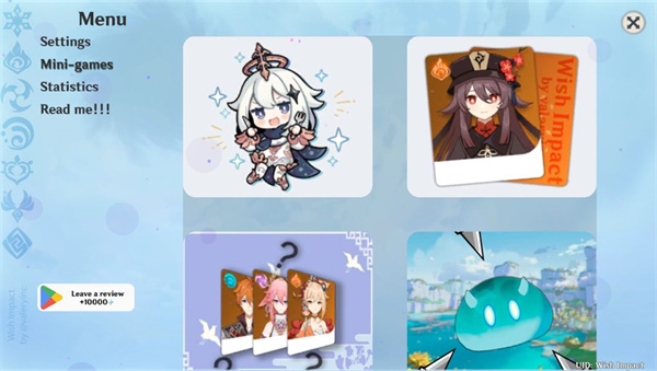 Wish Impact原神抽卡模拟器是一款逼真的非原神官方抽卡模拟器,用于模拟原神游戏中抽卡系统,可以帮助玩家了解抽卡概率,分析抽卡记录,并提供有关角色和武器的详细信息,当然,最主要的还是让各位小伙伴从中体验免费抽卡的快感。Wish Impact by valeryinc抽卡模拟1:1还原了原神卡池概率、抽卡动画以及最终结果显示等等,小手一点,十颗流星从天空中落下,如果抽出了你想要的角色或武器就快截图拿去给你的小伙伴炫耀吧。除了抽卡,在这款原神抽卡模拟器里还附带四款原神小游戏,非常的解压,适合用来娱乐消遣。欢迎各位小伙伴前来3322站免费下载Wish Impact原神抽卡模拟器!