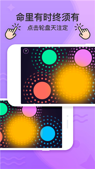 谁喝酒游戏中的点击轮盘就是抖音很火的各手指点击屏幕空白处,接着每个人都会出现一个颜色的球,然后等待几秒只会有一个幸运儿中奖啦,十分有趣,而且这些游戏不仅仅可在抽喝酒,还可以用来抽买单着哦,不仅玩法多多加能让聚餐不尴尬,让聚会更有趣。