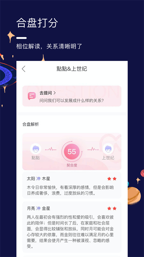 3、独有开放性合盘缘分评分功能,对两人缘分进行数字化评估,评分细节公开展示,让你知其然知其所以然。
