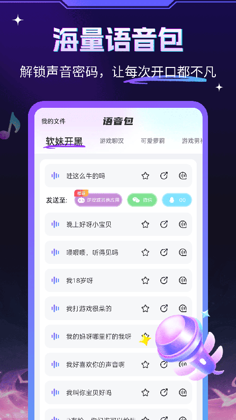 游戏变声器大师app是一款集录音变声、文字变声、音频变声和语音包变声于一体的专业变声软件。游戏变声器大师内置多款游戏语音包,适用多款游戏场景,只需打开悬浮窗,就能与游戏搭子用音效实时畅聊,给游戏增添更多乐趣。当你不方便发出声音?游戏变声器大师app也支持文字变声,轻轻一点,文字即可转变语音。软件还能自定义变声,用自己的声音制作语音包,是不是很有趣呢。