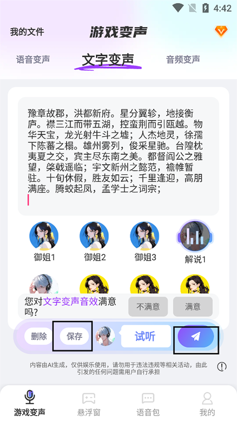2、文字转换语音:通过直接复制粘贴即可将你想要表述的内容完整表述,并且可以切换多种语音包效果。