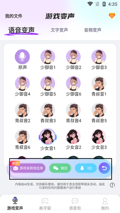 5、悬浮窗:支持悬浮窗畅聊,用户可以尽情调整声音,创建更多语音特效,让你的声音充满无限可能。