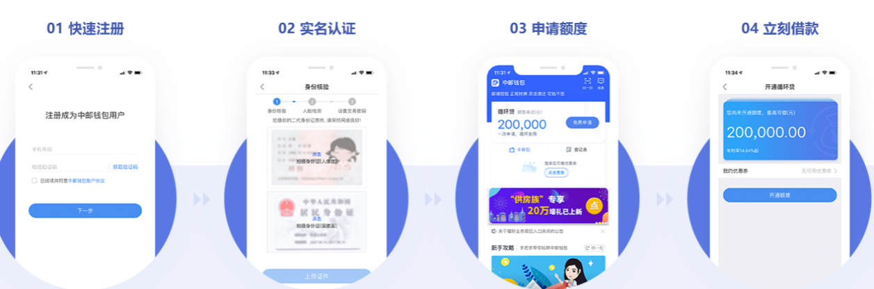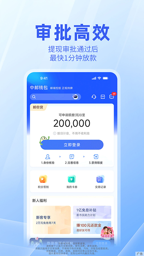中邮钱包,您的私人口袋ATM。中邮钱包目前开放邮你贷系列消费贷款产品,可使用优惠券抵扣利息。使用手机号码注册登录后并完成完成实名认证,即可体验优质高效的线上贷款服务。正规持牌机构,钱的问题,就找“中邮钱包”。