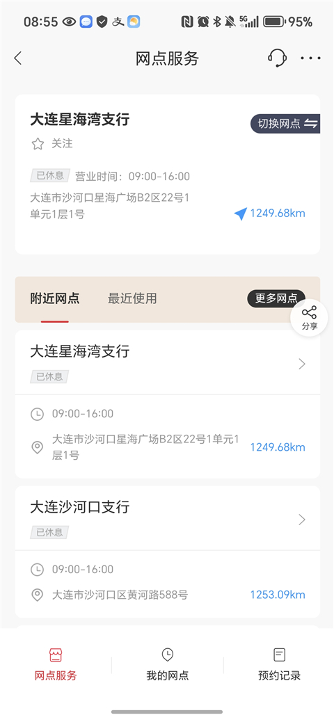 4、系统会自动通过手机定位功能获取你当前的位置。若定位不准确,你可以手动选择所在城市或输入具体地址。确定位置后,页面会列出附近的吉林银行网点信息,包括网点名称、地址、距离、营业时间等,部分网点还会显示联系电话和可办理的业务类型。若需前往网点,可点击具体网点地址,选择使用手机自带的地图软件进行导航。