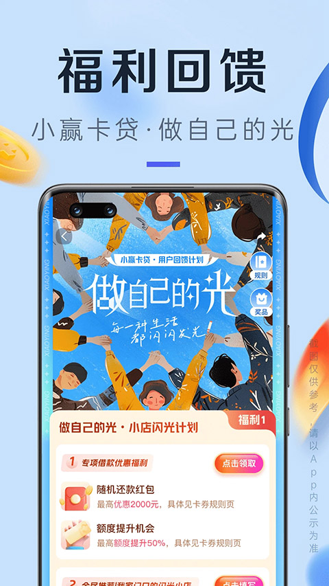 小赢卡贷app是小赢科技旗下的一款轻松借钱贷款软件,其具有额度高、利率低、还款周期灵活等产品特点,能有效平衡还款压力。该软件不仅申请门槛极低,无抵押、无担保,额度1000-80000灵活可选,而且全程线上完成,后台极速审核,最快当日即可放款,最大限度满足不同用户的借款服务需求。除此之外,这款软件创新以人脸识别、智能扫描以及大数据风控等技术为基础,能根据用户的信用状况在申请额度。与此同时,小赢卡贷app操作简单,使用方便,只需要先进行手机注册,再人脸实名认证即可开始申请贷款。不仅不需要用户提交任何东西作为抵押,也不用寻找第三人为你作担保,只要凭借你的信用分即可借贷,轻松为大家省下了不少的繁琐流程,是你日常生活消费必备的借钱神器。