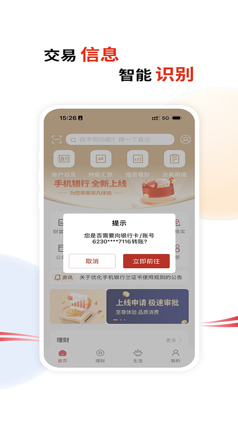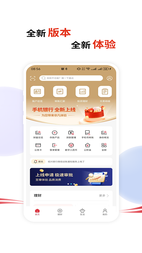 绍兴银行app官方版是专为绍兴银行用户所推出的一款手机银行软件,这款软件不仅可以存款转账快速管理经济,而且还可以理财贷款,同时还兼具账户管理、转账汇款、生活缴费、投资理财等超多功能于一体为用户们轻松实现移动金融。同时,该软件还会通过专业密码控件、短信验证、u盾来保障用户资金安全并可确保用户的账户信息不受到任何外泄,并且用户能够通过它提供的生活服务办理生活相关的业务来带给您全新流畅的用户体验,另外还依托零售ai营销大数据算法打造出“猜你喜欢”精准推荐模式为用户们推荐适合的产品。不仅如此,这款手机银行软件还有着非常新潮的全新时尚界面可以给人最好的视觉效果让你在使用时更加轻松舒适,此外更是有着账户查询、账户管理、收款人名册、行内转账、手机号转账丰富的金融服务以及可以根据客户需要适时推出各种生活类金融工具来做你真正的贴心的手机银行伙伴。