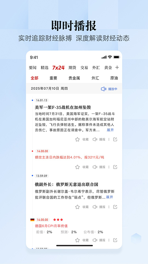 2、快讯行情日历,7×24小时,不间断进行及时、权威、专业的财经资讯直播与市场解读;