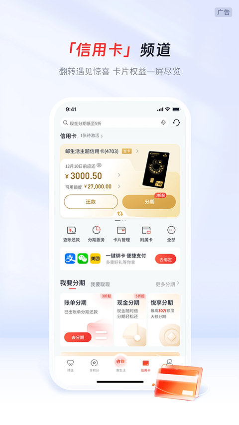 中国邮政储蓄银行信用卡APP提供7×24小时全天候信用卡业务服务,超越时空限制,轻松省时。