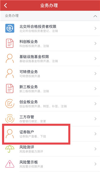 3、业务办理:创业板转签、变更三方存管银行,找回资金账号等20余项业务线上快捷办理,和营业部排队说ByeBye