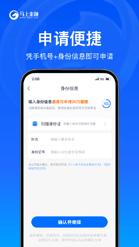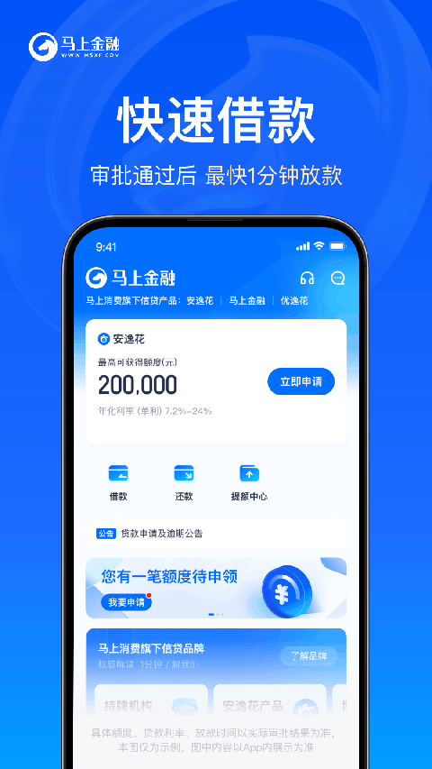 马上金融App是专为广大年轻人用户所量身打造的一款循环额度的信贷产品,提供了马上贷、信用钱包、商品贷等多个借贷产品于一体,让广大用户只需通过手机注册并登录,即可快速凭身份证、银行卡等认证一键在线申请,高效审批、闪电放款、享受额度可至高达20万元的借款特权,从而告别门店排队、复杂表格填写过程。