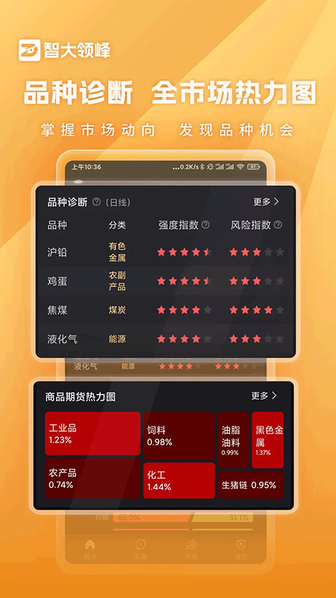 更为重要的智大领峰金融终端App拥有多种量化看盘工具,传承TB多年的量化经验,包括趋势强度、风险指数、力度指数等。这些指标不仅能够帮助用户快速捕捉市场趋势,还能深入分析主力资金动向,帮助投资者更好地制定交易策略。无论是新手还是专业投资者,都能在智大领峰中找到适合自己的投资利器,实现更稳健、更高效的投资理财。