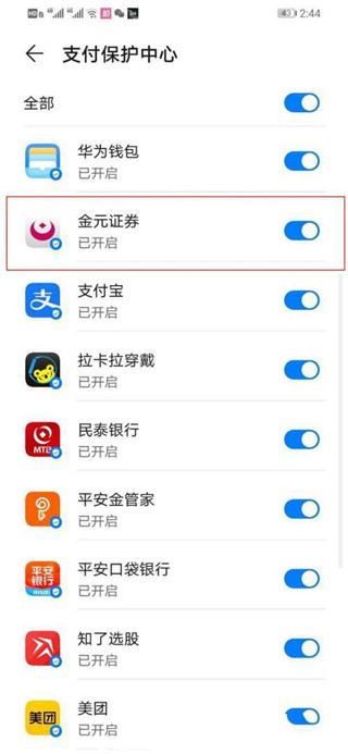 5、点开“支付保护中心”,在该界面找到“金元证券”,将其后边的开关条打开即可。