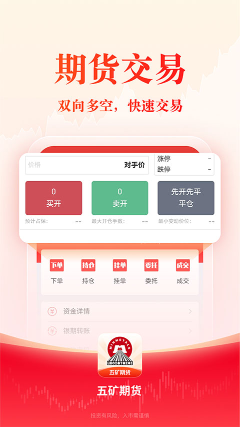 五矿期货app是一款集行情、交易、资讯和业务于一体的全功能期货服务软件,这款软件不仅包含金所五档行情、上期所五档行情、上期能源五档行情、郑商所五档行情和大商所一档行情这些国内期货行情,同时也包含国外各期货行情,比如芝加哥CBOT、芝加哥CME、纽约COMEX等等近20个交易所信息,提供全方位多角度的信息让用户了解更多实时行情。除此之外,软件还拥有其他业务功能,包括账户解锁、密码重置、适当性评估、身份证换新、找回期货号、适当性品种权限申请、修改一般信息、期货结算银行信息更新等常用功能,为用户享受最便捷的体验,线上即可一键办理。软件还拥有云预警功能,用户可自行设置一个云端的价格指标,当价格触及指标线时,会通过推送进行及时提醒用户,为用户的投资理财进行保驾护航,