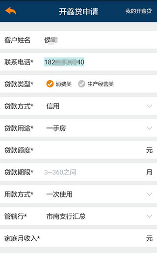 6、开鑫贷可申请消类贷款和生产经营类贷款,贷款方式分为信用、担保、联保、抵押、质押,贷款用途有一手房、二手房、商用房、装修、购车和医疗健康,贷款额度输入想贷款的金额,贷款期限在3~360个月之间,用款方式分为一次使用和循环使用两种,再输入申贷人所在的管辖行和申贷人的家庭月收入,提交即可。
