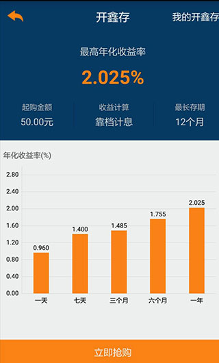 5、开鑫存是一款靠档计息产品,50元起购,无固定存期,最多可分12期,利率等同于定期存款利率,可提前支取,并根据本金的实际留存时间对应的存款利息靠档计息,兼具收益性和流动性。