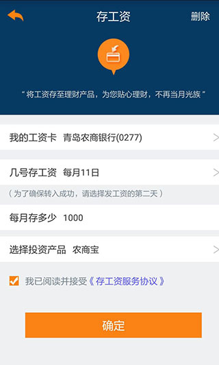 7、存工资即可将绑工资在每月固定日期转存至农商宝,收益高、起存金额低。此款产品对于“月光族”来说特别实用,可以在发工资之后立即将工资存入理财账户,防患于未然!