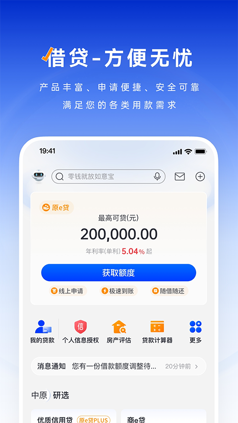 原e贷、永续贷、商e贷、住房按揭等多种消费类、经营类贷款,产品丰富;无担保无抵押的信用贷款,申请便捷、安全可靠,满足您的各类用款需求。