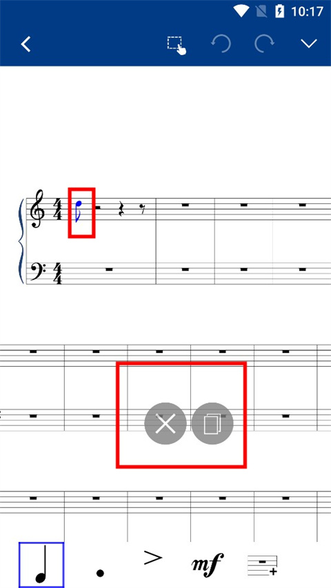 单点音符选中一个音符;长按1秒然后拖动可以框选多个音符;选中后可以选择删除选中的音符或者复制选中的音符。