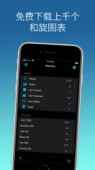 iReal Pro安卓版是一款专为音乐爱好者打造的工具软件,是业内专业音乐人的首选软件,旨在帮助所有音乐爱好者掌握他们的艺术。软件的使用范围极其的广阔,曾被评为2010时代杂志50项最佳发明之一。软件功能十分强大,大家通过使用APP可以进行创建、编辑、打印、分享等,还能在APP中收集自己最喜爱的歌曲的和弦图表,以便在练习或表演时作为参考。软件操作简单,只需几个简单的步骤就可从论坛下载超过千首歌曲,为大家提供了最方便的下载方式。另外,iRealPro官方最新版拥有51种不同风格的伴奏,包括摇摆、民谣、吉普赛爵士、兰草、乡村、摇滚等,以及还有各种个人化风格的声音,包括钢琴,电子琴,民谣和电吉他等,帮助大家可以更好的创造属于自己的音乐。此外,软件还可以模拟一支音色逼真的乐队,在您练习的时候为您伴奏,让你可以更有效地进行练习。