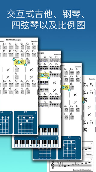 3、显示每首乐曲中的和弦建议音阶以帮助即兴。