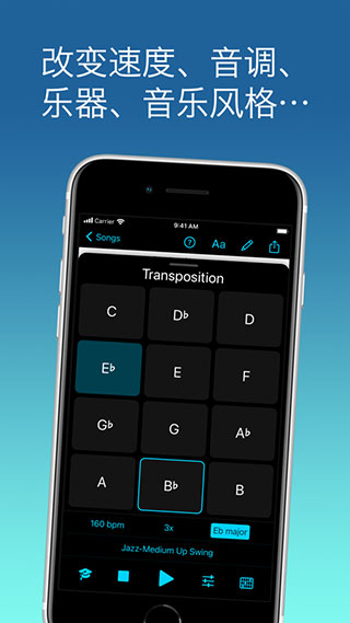 包含的47种不同伴奏风格,其中就包括Swing,Ballad,GypsyJazz,Bluegrass,Country,Rock,Funk,Reggae,BossaNova,Latin等。软件还有12张蓝调风格可作为一次性应用内购买,以各种声音个性化各种风格,包括钢琴,Fender罗得斯,声学和电吉他,声学和电动贝司,鼓,振动器,器官等。大家都可以录制到自己的伴奏中。
